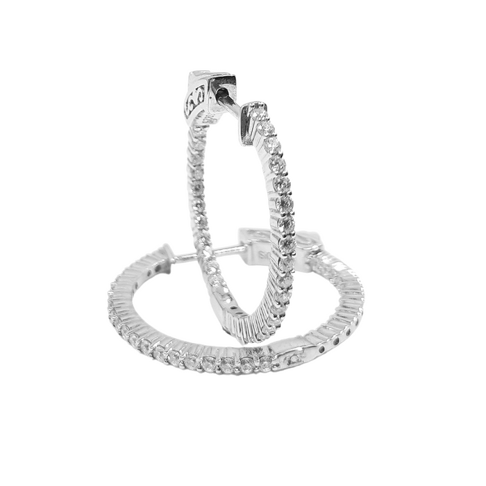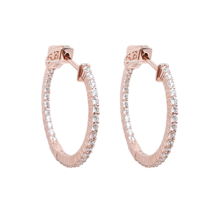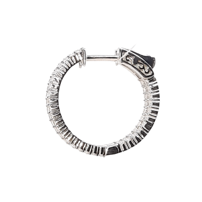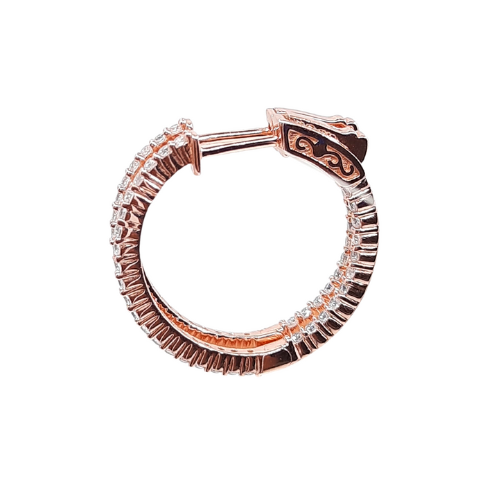 Beautiful hoop earrings with sparking round diamonds all around the hoop. Diamonds inside the hoop add extra brilliance to this incredible earrings. Diamonds studded in 14K gold create a fine jewelry piece to be cherished all life long. Unique safe lock adds extra security to the hoop earrings that will surely earn many compliments.